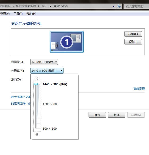 單擊“分辨率"下拉按鈕, 在彈出的下拉列表中通過拖動調(diào)節(jié)滑塊調(diào)整分 辨率的大小。系統(tǒng)會顯示針對用戶顯示器的推薦 分辨率。