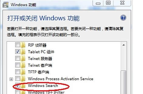2. 在隨后打開的對(duì)話框中,找到并勾選“Windows Serach”,在最后會(huì)彈出一個(gè)對(duì)話框,然后“確定”,等上幾分鐘就行。接著點(diǎn)“開始”就能看到搜索框了。