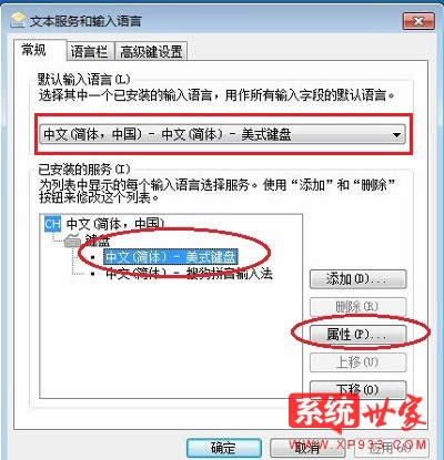 2. 在彈出的“文本服務(wù)和輸入語(yǔ)言窗體里面”,點(diǎn)擊“中文(簡(jiǎn)體)---美式鍵盤”,這時(shí),右邊的屬性按鈕就可以點(diǎn)擊了。點(diǎn)擊那個(gè)屬性按鈕;