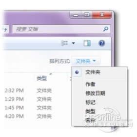 2. 在庫(kù)窗格(位于文件列表上方)中,單擊“排列方 式”菜單,然后單擊一個(gè)屬性?捎脤傩詫⒁罁(jù)您 所在庫(kù)的不一樣而有所不一樣。