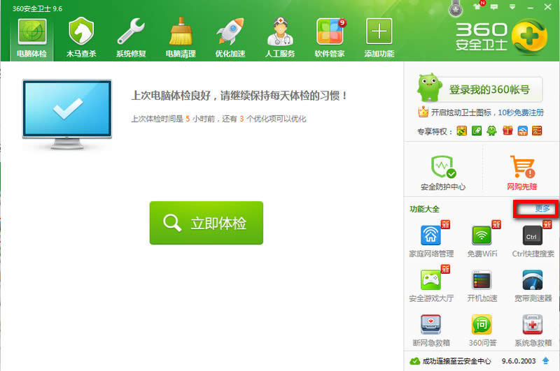 第一步:打開"360安全衛(wèi)士"程序,在右邊的框框里,找到"更多",點擊"更多功能"項。
