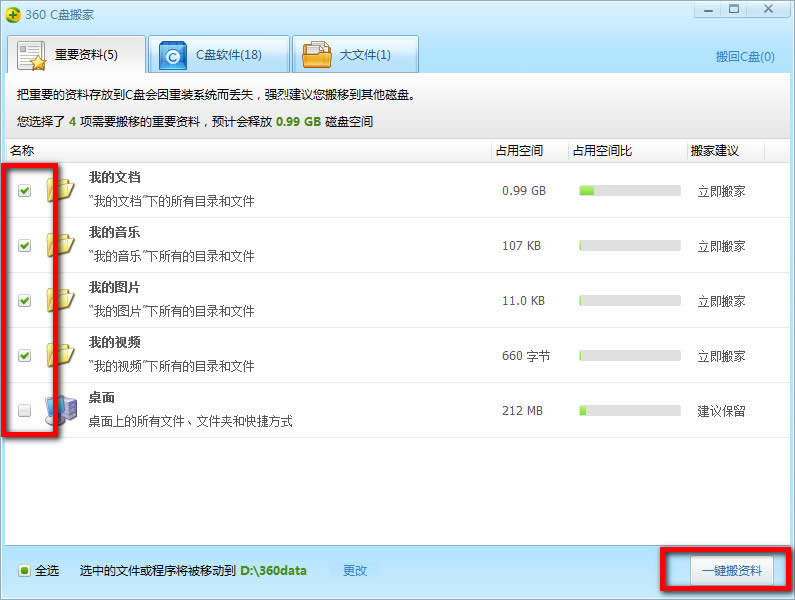 第三步:接著程序會對整個磁盤進行掃描,以確定可以進行搬家的內(nèi)容。在"重要資料"項中,勾選"我的文檔"。