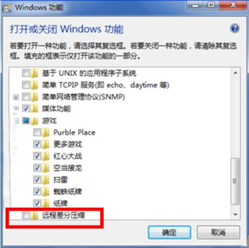 3.稍等片刻,出現(xiàn)“Windows功能”選項(xiàng)框,將里面的“遠(yuǎn)程差分壓縮”選項(xiàng)的勾去掉,然后點(diǎn)“確定”,之后重啟計(jì)算機(jī)即可提高文件復(fù)制奇慢的問(wèn)題。