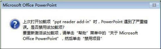 1、重啟電腦再運(yùn)行PowerPoint 2003,此時(shí)會(huì)又提示:上次打開加載項(xiàng)“ppt reader add-in”時(shí),PowerPoint遇到了嚴(yán)重錯(cuò)誤。是否禁用該加載項(xiàng)?