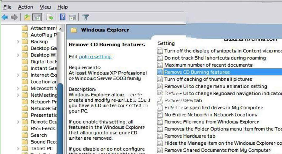 3、選中Windows Explorer,然后在右側(cè)窗口中找到Remove CD Burning features(移除CD刻錄功能)并雙擊,選中Enable(開(kāi)啟),重啟生效。