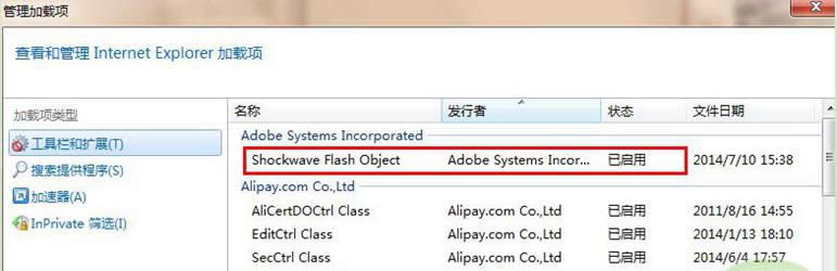 3、在“管理加載項”里啟用“Shockwave Flash Object”。