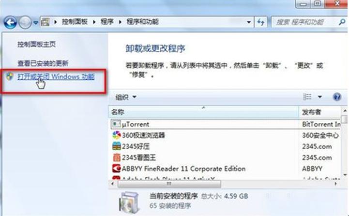 2、在“程序和功能”下選擇“打開或關(guān)閉Windows功能”。