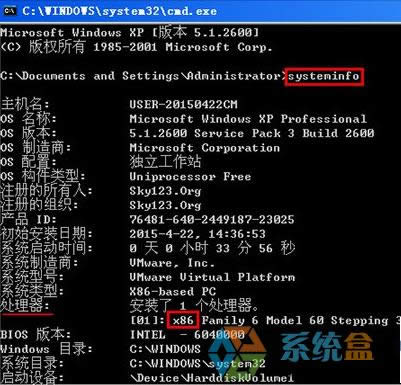 第三步、在彈出的命令行中輸入“systeminfo”并按回車鍵確定,稍等片刻會(huì)顯示出系統(tǒng)各類信息,找到“處理器”字段進(jìn)行查看相應(yīng)信息,如果顯示X64則CPU為64位,若顯示X86則為32位。如下圖所示: